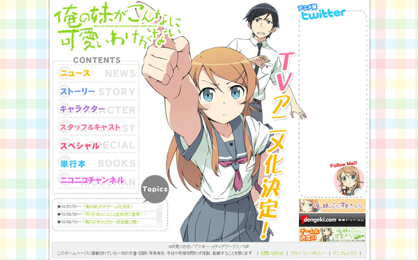 哥哥高阪京介(17歲)和妹妹高阪桐乃(14歲)兄妹兩人的關係近幾年處於冷戰狀態。從某個時間點開始,桐乃看到哥哥時連打招呼都沒有,只會用像是看到髒東西般的眼神瞪他。京介認為這種關係也會一直持續下去。 某天,京介在門口撿到從來沒看過的魔法少女動畫“繁星☆Witch梅露露”的DVD盒子,裏面竟然不是動畫的DVD,而是成人遊戲“和妹妹戀愛吧~”的光碟。京介在晚餐時用梅露露的話題試探誰是光碟的物主,但只得到父母充滿偏見的否定意見。 就在那天晚上,連打招呼都不會的妹妹突然來到京介房間,並且說她有事情想要商量。原來桐乃迷上了萌系動畫以及美少女遊戲中的妹系角色,卻都不敢告訴別人,只能一直悶在心裏。被哥哥知道了自己的秘密後,從此開始了和哥哥之間的“人生諮詢”。